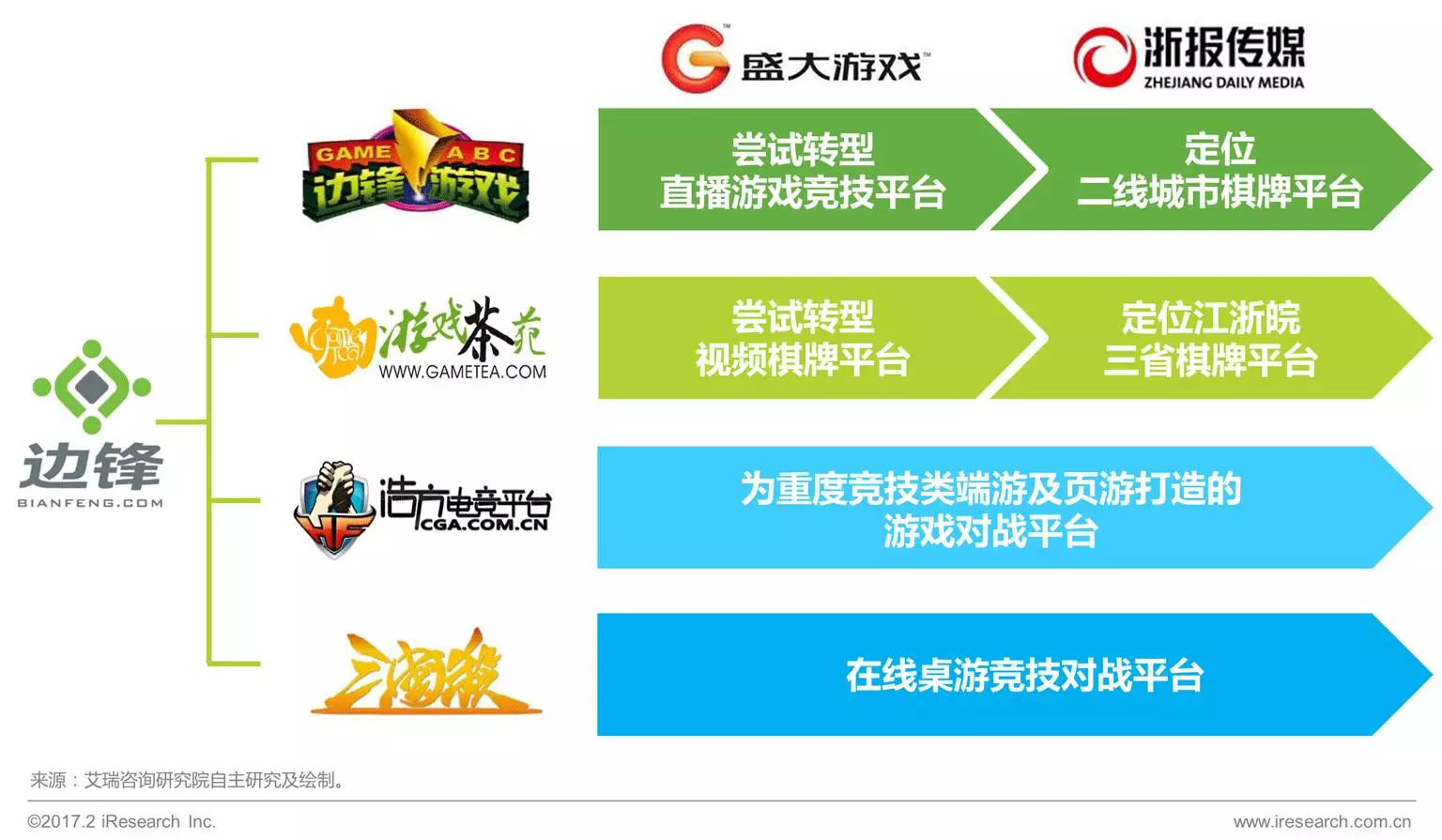 通过多个品牌平(píng)台的运作,边(biān)锋(fēng)集团成功覆盖了(le)大量线上(shàng)对战(zhàn)平台(tái)用户。在经历了两(liǎng)次重大(dà)并购之(zhī)后(hòu),在新东家的重塑(sù)与转型下(xià)边锋游戏与(yǔ)游戏茶苑(yuàn)两家平台(tái)的差异化愈发明显,边(biān)锋集团的多品(pǐn)牌战略为自己在地方游戏市场争得(dé)了(le)一席之地。