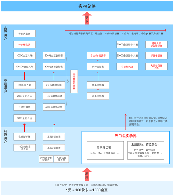 从充值看,1元(yuán)=1000金(jīn)豆(dòu);从兑换看,1元=100秋卡。乍看一下,做留存(cún)的比赛大部分在送(sòng)钱给用(yòng)户,做(zuò)收入(rù)的比(bǐ)赛收(shōu)支比(bǐ)太高,收(shōu)益空间又不大(dà),会以为JJ斗地主入(rù)不敷出。随着深入研究,会发现,尽管JJ斗地主经济体系严格遵守1元=100秋(qiū)卡=1000金豆,但这之(zhī)间大有文章——