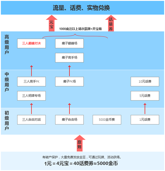 从(cóng)充值上看,1元≈5000金币;从兑换(huàn)上看,1元(yuán)=4元(yuán)宝=40话(huà)费券。但是(shì)博雅(yǎ)斗地主(zhǔ)采(cǎi)用(yòng)的是宽松的经济体系,会通过破产保护、签到、活动等(děng)方式大(dà)量发送金币,所以该表(biǎo)格仅能反映趋势(shì)。但已能发现,在实物比赛(sài)场中,博雅斗地主(zhǔ)完(wán)全依靠自己采购话费、流量来做留存,成本由(yóu)自己承担。只要获(huò)得一定实物,用(yòng)户对产品(pǐn)体验的容忍度很高。