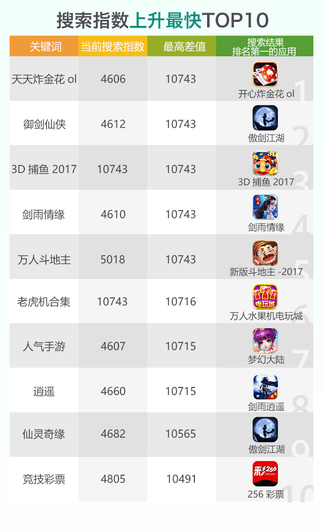而在指数上升(shēng)最快TOP10的(de)榜单中,棋牌类关键词的表现也同样不俗(sú),当然,也从中(zhōng)可以看得出有些应(yīng)用的排名,是与刷榜公司(sī)的“精诚(chéng)合作(zuò)”而得来的。