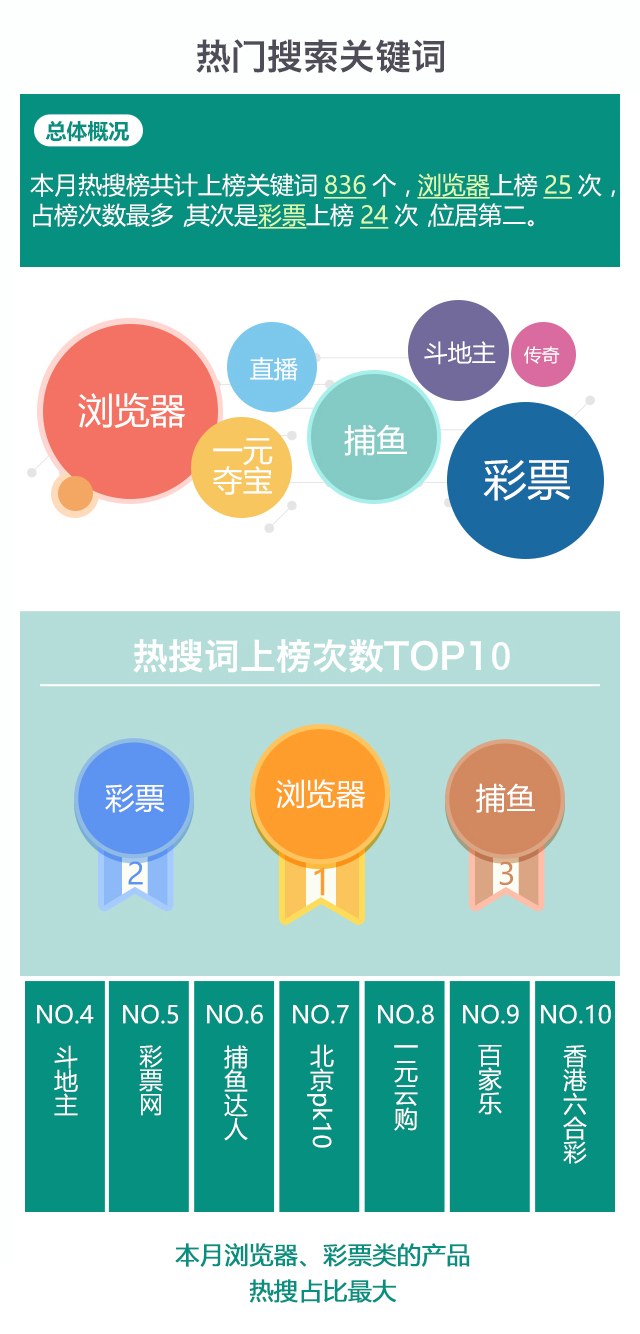 从上述榜单可(kě)以看出(chū),棋(qí)牌、捕鱼(yú)、街(jiē)机类的关键词(cí),占据了搜索指数TOP10中的(de)6席,而所谓的一元夺宝,也或(huò)多或(huò)少带有一些**性(xìng)质。