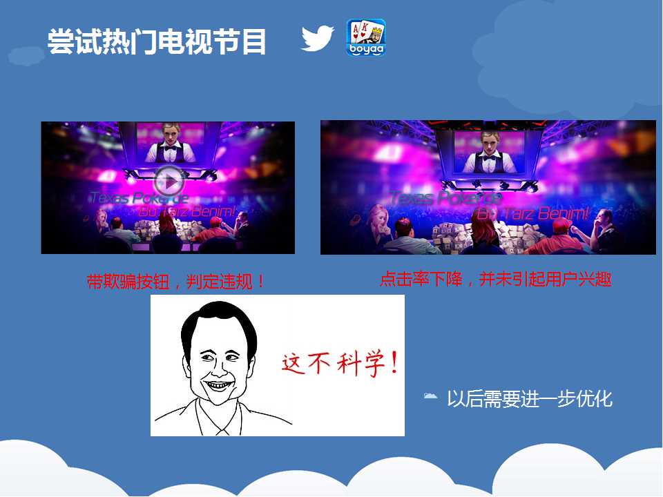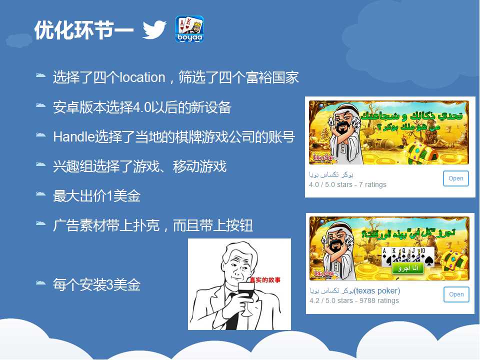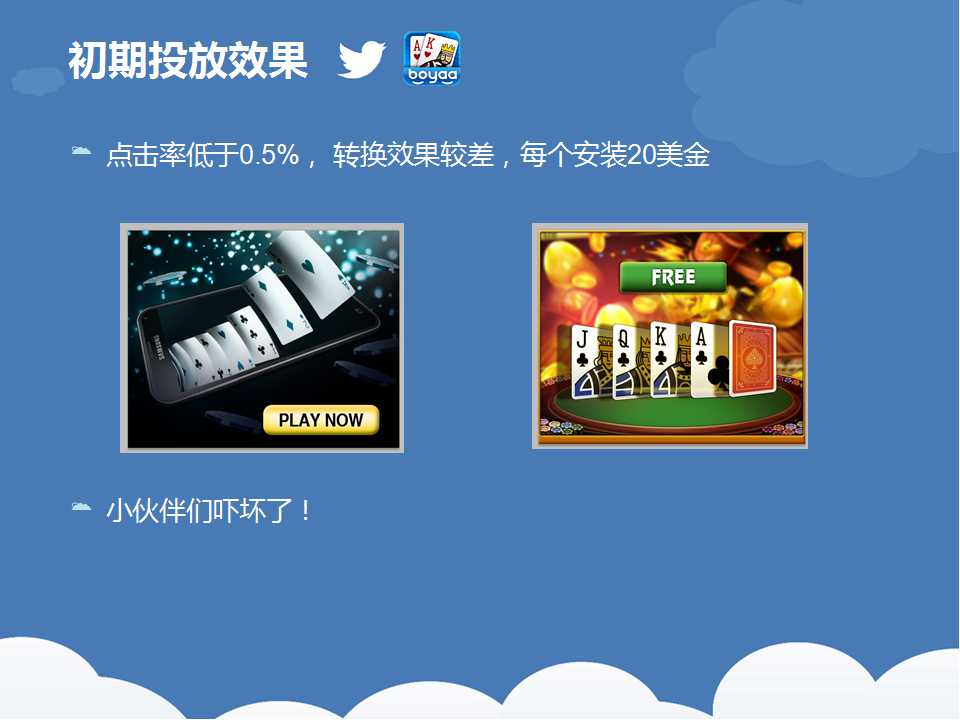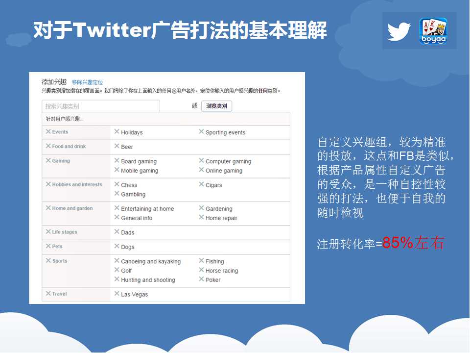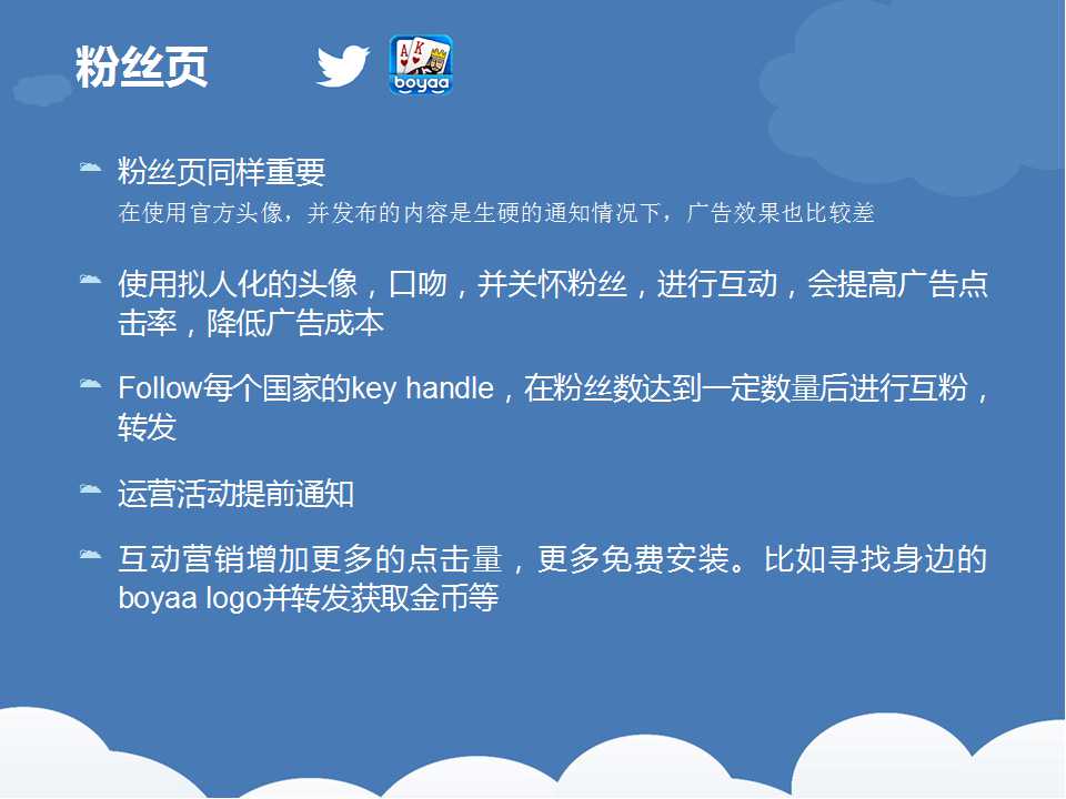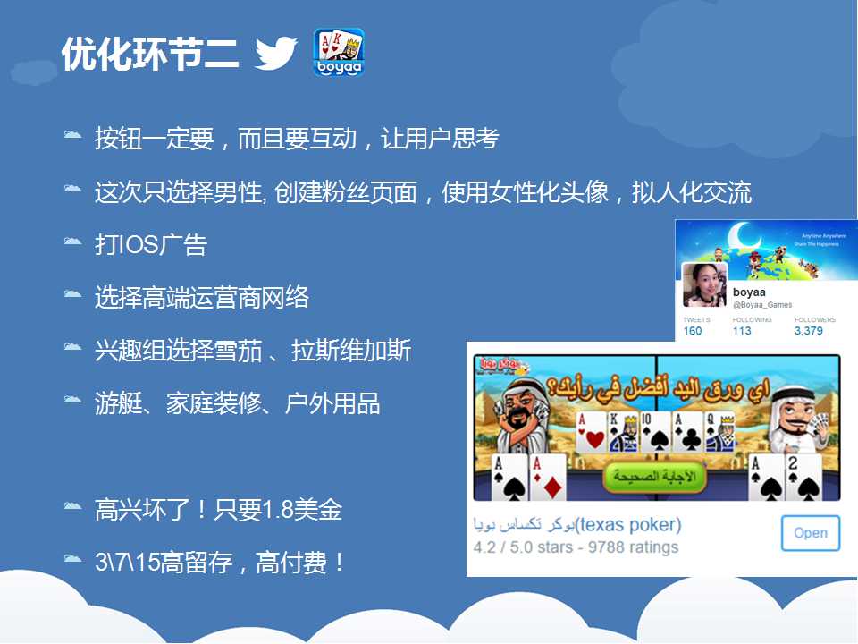 在这里,欧陆平台只想说,推广没有(yǒu)可以套用的模板。每个人手中掌握的资源不一样,产品(pǐn)的特征不一样(yàng),所能做到的事情也就不一样(yàng)。推(tuī)广(guǎng)方案肯定是要结合自身实(shí)际来量身(shēn)打造的(de),是要有数据累计的,同(tóng)时也是有试错成本的。说到这里,我们不妨来看看国(guó)内一(yī)线(xiàn)厂商博雅互动,是怎么在推特上做推广的。希望(wàng)能给广大运营商提供一些(xiē)推广思路。