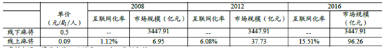 由于线下单局麻(má)将花(huā)费约为(wéi)0.5元/局/人(rén),而线上花(huā)费(fèi)为0.09元/局/人,考虑到互联网(wǎng)化率(lǜ)的提升,我们预计2016年线上(shàng)麻将市场规模为96.26亿元。
