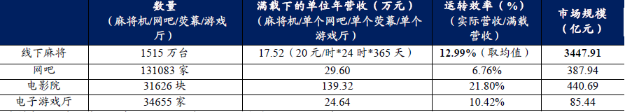 而对棋(qí)牌室走访调研得来的数据显(xiǎn)示,棋牌室平均一桌(zhuō)麻将每(měi)小时(shí)20元,平均每小时可以打10局,因此单人收费是0.5元/局,棋牌室几乎是24小时营业(yè),进而得到(dào)线下一台麻将机(jī)满(mǎn)载运转(zhuǎn)时(shí)的年营收为17.52万元。而参(cān)照《VR风向(xiàng)标:线下率先爆发,渠道价值(zhí)凸显》报(bào)告(gào)数据显示,电(diàn)影院、网吧、电子游戏厅运(yùn)转效率分别为21.8%、6.76%与(yǔ)10.42%,三大类线下娱乐(lè)市场的平均运转效率12.99%,由此推算线下(xià)麻将市场规模大(dà)概(gài)为3447.91亿元。