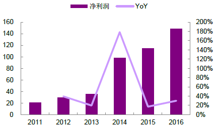 2011-2016公(gōng)司净利润(单位(wèi):百万人民(mín)币(bì))