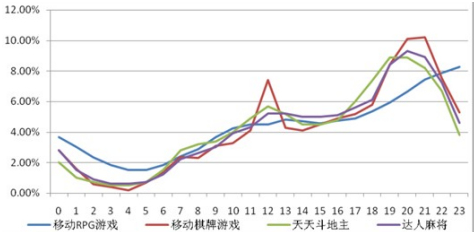 在(zài)具(jù)体(tǐ)产品方面,报(bào)告以联众的《达(dá)人(rén)麻将(jiāng)》为例表明,在用户(hù)活跃高峰和次高峰时(shí)段,《达人麻将》的用户比例均(jun1)超过整体(tǐ)移动RPG游戏的水(shuǐ)平。其中,在20:00前后,《达(dá)人麻将》用户(hù)比例接(jiē)近10%,较整体移(yí)动(dòng)RPG(用户比例不到7%)超出3%。