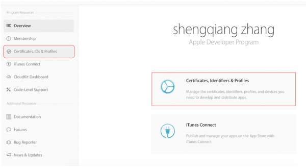 4. 登录之(zhī)后,点(diǎn)击Certificates, Identifiers & Profiles,为项目创建Bundle ID 、发布证书、以及权限文件(Profiles)