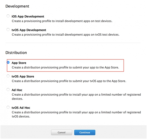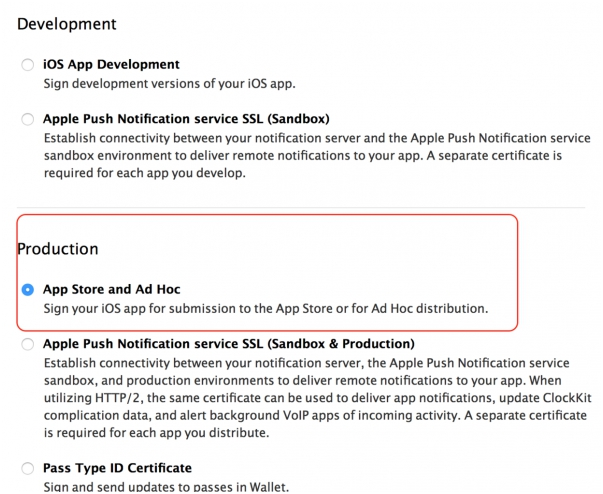 点击 “+”按钮(niǔ)之(zhī)后,出现以下内容(róng)界面,只需要选(xuǎn)择“App Store and Ad Hoc” 即可,然后continue。