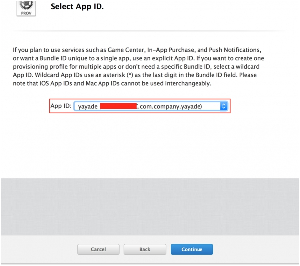 App ID : 选择(zé)含有对应Bundle Id 的app Id。