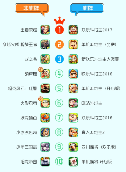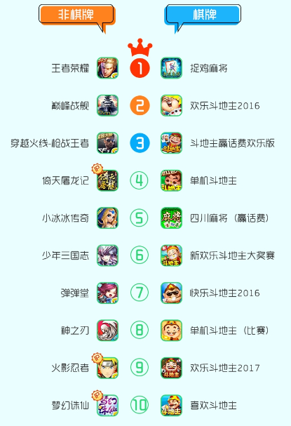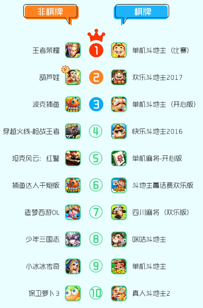 在榜单(dān)中我(wǒ)们可以发现(xiàn),棋牌类下载(zǎi)前十排行榜中,斗地主占据了8个(gè)位置,麻将(jiāng)类游戏占据2席。