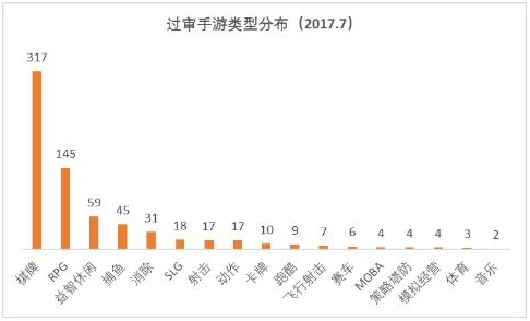 而(ér)从(cóng)过审的游戏类型(xíng)上来看, 继6月份棋牌游戏(xì)数量大增之后,7月份该类型产品数量依旧居高不下。共计317款,虽然相较5月(yuè)过(guò)审的324款有些许下降,但仍然是一个可怕的存在。是排(pái)在(zài)第2位的RPG游戏(xì)的两(liǎng)倍之多(duō),且从占比来看,比6月份更高。与此同时,过审的捕鱼(yú)游戏数(shù)量(liàng)也维持在(zài)第四名的(de)位(wèi)置,达到(dào)41款,相比6月下(xià)降了4款(kuǎn)。
