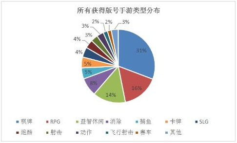 而如果我们将时(shí)间线拉(lā)长一点, 从2013年(nián)到2017年,获得版号的手游(yóu)类型分布(bù)方面,棋牌类产品(pǐn)占比遥(yáo)遥领(lǐng)先,高达31%。这是一(yī)个意(yì)料之外却又(yòu)意(yì)想(xiǎng)之中的数据。毕竟在很(hěn)长一段(duàn)时间内,APP STORE畅销榜上几乎有一般都是(shì)棋牌游戏。而(ér)且从广电审(shěn)核的(de)角(jiǎo)度来说,棋(qí)牌游戏大部分(fèn)玩法都较为固定,游戏(xì)功(gōng)能很少触碰过审(shěn)红(hóng)线,相对来说过审比较容易。实际上从2016年7月开始,每个月都是棋牌类游戏(xì)过审数量最(zuì)多。当然,这与地(dì)方棋牌自去年(nián)下半年开始在全国各地的爆发(fā)有关。