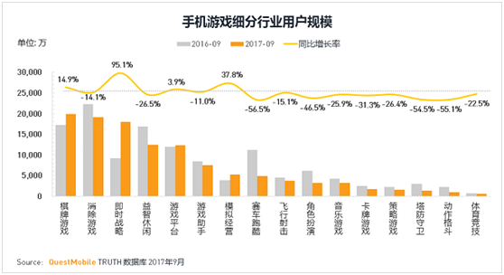 据Questmobiles提供的数据显示,2017年第三季度(dù)用户规模超过一亿的手游(yóu)类型有5大类,依(yī)次为:棋牌(pái)、消除、即(jí)时(shí)战(zhàn)略、休闲、游戏平台(tái)。其中棋(qí)牌类手游的(de)用户(hù)规模(mó)接(jiē)近两亿,位居(jū)第一,比消除类手(shǒu)游1.8亿规模的用户略高。而去年(nián)这个时候,消除类手游的用户规模(mó)是(shì)要比棋牌类高的。