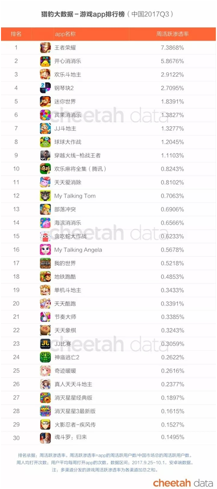 而根据猎(liè)豹智库(kù)提供的数据,我们可以清(qīng)楚的看到手游(yóu)APP TOP30的排行(háng)。排行以周活跃渗透(tòu)率为(wéi)标(biāo)准(zhǔn),周活跃(yuè)渗(shèn)透率的(de)计算方法(fǎ)为:周活跃(yuè)用户数除(chú)以中国(guó)市场(chǎng)总周活(huó)跃(yuè)用户。你可(kě)以(yǐ)直接看作2017年Q3手游行业,周活(huó)跃(yuè)用户排行榜。由于包含其他所有应(yīng)用的数(shù)据,因(yīn)此周活跃渗透率(lǜ)能上1%的产品,已经可(kě)以挤进(jìn)游戏榜前十(shí)。