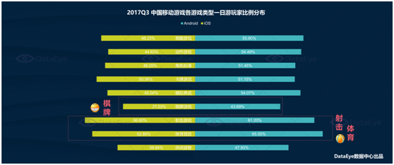 而把(bǎ)数据更细分地看的话,我们可以看到棋牌游戏玩家的次日留存率(lǜ)是(shì)最(zuì)好的。不管是(shì)androids还是ioses端“一日游”的玩家(jiā)占比(bǐ)都是最(zuì)低的。ioses平台(tái)为37.03%,androids平台为43.69%。这在很大程(chéng)度上弥(mí)补了棋牌游戏付费率(lǜ)相较其他游戏类(lèi)型低的局面。