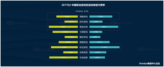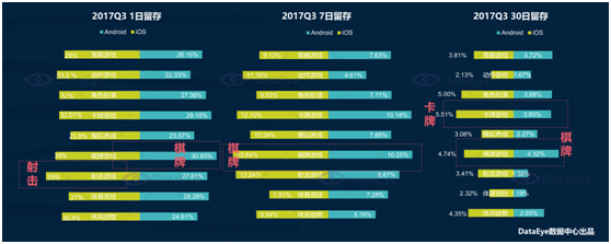 而如果把时间维度(dù)拉得更长一(yī)些,我们能发现(xiàn),棋牌游戏的优势(shì)会更(gèng)明显。2017Q3,一日留存上ioses棋(qí)牌游戏留存排名第二34%,androids平(píng)台棋牌(pái)游戏留存最高30.83%;7日留存上棋(qí)牌游戏表(biǎo)现不俗,ioses和androids留存分(fèn)别达到12.64%和10.25%是双(shuāng)料冠(guàn)军;30日留存上(shàng),ioses平台棋(qí)牌游戏4.74%位居第三,androids平台棋牌(pái)游戏4.32%居(jū)首。换句话说,棋牌游戏的(de)用(yòng)户维护会比其他游戏类(lèi)型(xíng)更好做一些。
