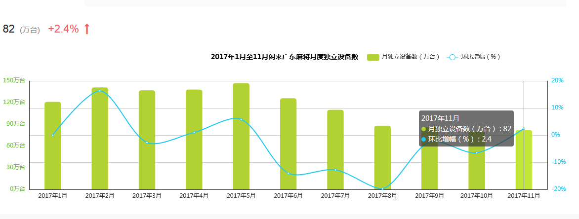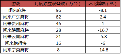 另外,闲(xián)徕互(hù)娱(yú)旗下另外一(yī)款标(biāo)志性的(de)地方棋(qí)牌产品《闲(xián)来广东麻(má)将》,在今年(nián)下半年也面临同样的市场状况。根(gēn)据(jù)艾瑞咨询(xún)发布的数据(jù),《闲来(lái)广东麻将(jiāng)》的月(yuè)度独立设备数在(zài)今年5月(yuè)达到峰值,高达147万台。而截止至11月(yuè),月度独立设(shè)备数为82万(wàn)台。