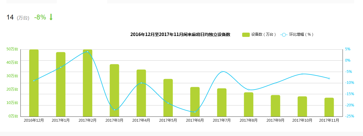 而《闲来麻将》的日均独立设备数也同样处于逐(zhú)月降低(dī)的(de)状态。从高峰时(shí)期的50万台降低到11月的14万(wàn)台,降幅高达350%。大厂的用(yòng)户数据都(dōu)被腰斩,也(yě)就不难看出湖南地(dì)区棋牌市场的(de)竞争激烈程度(dù)。