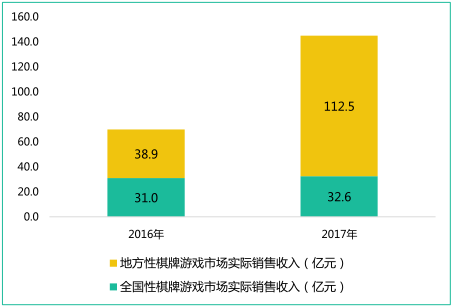 2017 年,地方性棋(qí)牌游戏市(shì)场实际销售收入达(dá) 112.5 亿元,同比(bǐ)增长(zhǎng) 189.0%;全国性棋牌游戏市场实际销(xiāo)售收(shōu)入达(dá) 32.6 亿元,同比增长 4.9%。