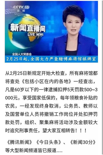 近(jìn)期“25日起全国严查棋牌室”的消息在不少人(rén)的朋友(yǒu)圈疯传。这(zhè)条网传信息(xī)是一(yī)条不折不扣(kòu)的谣(yáo)言,最早出现在2014年。