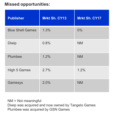 比如,Blue Shell Games 2013年占了1.3%的(de)市场(chǎng)份额,去年在市场上已经消失了。High 5 Games曾(céng)占(zhàn)2.7%的市场份(fèn)额,已经锐减了一半以上,只剩(shèng)1.2%的市场份额。Diwip和Plumbee曾经也分别占了0.8%和(hé)1.2%的市场份额,但各自被Tangelo