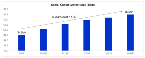 据Eilers & Krejcik Gaming的报(bào)告,未来5年,到2022年,社交(jiāo)**类游戏市(shì)场规模(mó)复合年(nián)增长(zhǎng)率为7%,从2017年的45亿美元增长到65亿(yì)美元(yuán),增长速度明显(xiǎn)放缓。