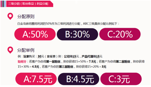 模(mó)式一:三级分销,基于个人推广二维码发展粉丝(sī)。购买任意一款金币套餐(如:30 元=900 房钻=30 张房卡)就可以成为(wéi)代(dài)理(lǐ),代理可以收取(qǔ)发(fā)展的(de)三层粉丝(sī)的分成,假设(shè) 30 元套餐,公(gōng)司分 15 元,50%的收入都(dōu)分(fèn)给代理(lǐ),一级代理分 7.5 元,二级代理分 4.5 元(yuán),三级代理分(fèn) 3 元。
