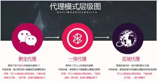 模式二:代(dài)理(lǐ)模式,通过微信群,发展成为群主代理、一(yī)级代理和区域代理。群主代理要求拥有不低(dī)于20人的微信玩(wán)家(jiā)群1个,通过购(gòu)买房卡(kǎ)销售给玩家赚取(qǔ)差价。一级代理(lǐ)要(yào)求拥有5个及以上的微信玩(wán)家群,享(xiǎng)受群(qún)主代(dài)理销售业绩提成奖励。区域代(dài)理要求管(guǎn)理区域内的一级代理和群主代理,享受区域内的销售业绩提成和其他奖励。