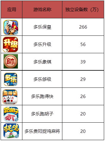 多乐游戏——就是今天欧陆平台要(yào)给各位读者介绍(shào)的主角。据欧陆平台了解到(dào)的(de)信(xìn)息,2018年2月(yuè),闲徕旗下月度独立设备超10万的APP共有8款,独立设备数为397万台。而(ér)多乐游戏旗(qí)下月度独立(lì)设备超10万的APP有7款,独立设备数为456万(wàn)台。旗下(xià)拳头产品《多(duō)乐保皇》的月度有效时(shí)长高达2858万(wàn)小时。相对应的,闲来(lái)旗下(xià)的(de)拳头产品《闲来麻将(jiāng)》为710万小时。