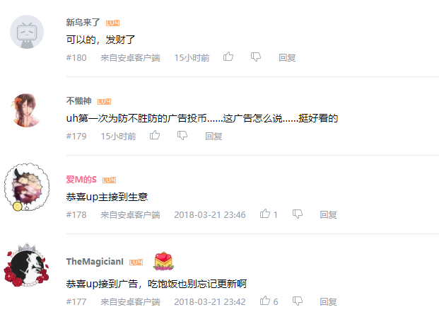 另外(wài),从弹(dàn)幕互动的内容来看(kàn),用户对此类(lèi)推广方式并(bìng)不(bú)反感。甚至会有B站用(yòng)户恭喜UP主接(jiē)到广告(gào)。这其实(shí)很好理解,毕(bì)竟很多(duō)B站的UP主(zhǔ)制(zhì)作(zuò)鬼畜视(shì)频内容是出(chū)于兴趣,但兴(xìng)趣不能当饭(fàn)吃,有广告(gào)投入,UP主才能可(kě)持续地产出高质(zhì)量(liàng)的鬼(guǐ)畜(chù)内容。