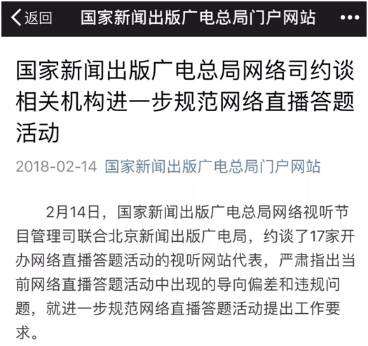 2 月(yuè) 14 日,广电总局发出通知,要求对网络视听(tīng)直播答(dá)题活动加强管(guǎn)理(lǐ),进(jìn)一步规(guī)范网上传播秩序,防(fáng)范社会风险。