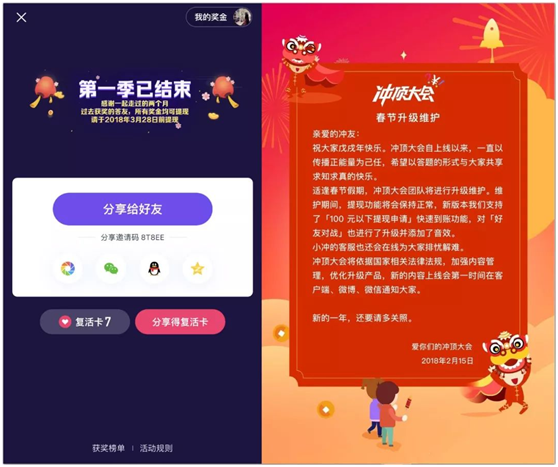 这则通知的发出(chū),基(jī)本给大部分做直播(bō)答题的平台判了“死刑”。原计划在年后结束的百万(wàn)英雄、百万赢家、黄金十秒等(děng)节目先(xiān)后(hòu)提前宣(xuān)告第(dì)一季结(jié)束,其(qí)他诸如(rú)冲顶大会、网易大赢(yíng)家、爱乐之(zhī)战等也(yě)贴(tiē)出(chū)了系统维护升(shēng)级的字(zì)样。