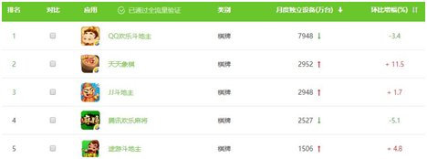 从艾瑞咨(zī)询提供的数据来看,《JJ斗地主(zhǔ)》从2018年初至今,基本维持近3000万的月(yuè)活。是除腾讯(xùn)系棋牌(pái)以外的一大巨头。这(zhè)也(yě)让它(tā)在月活排行榜(bǎng)上,始终(zhōng)在排名前五中(zhōng)占据(jù)一席之地。