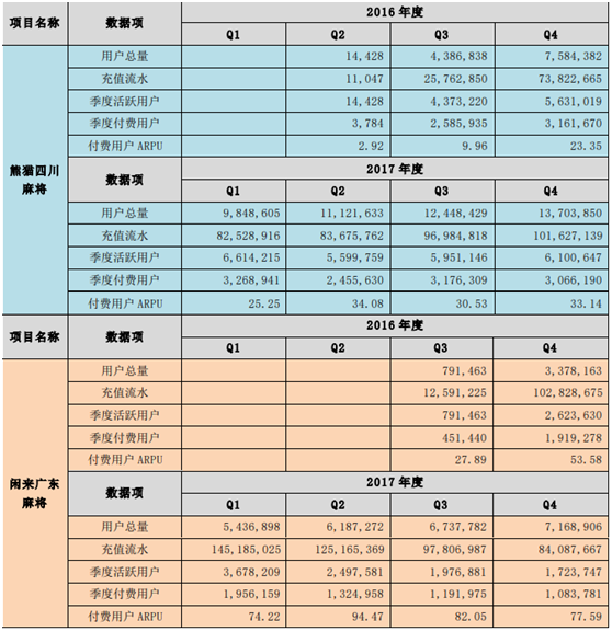 从(cóng)昆仑万维提供的数(shù)据(jù)来看,闲(xián)来旗下游(yóu)戏产(chǎn)品的收入主(zhǔ)要来源是玩家在(zài)游戏内购置的道具。而(ér)从具体运营数据来看,旗(qí)下产品《闲来麻将》、《熊猫四(sì)川(chuān)麻将》、《闲来广东麻将(jiāng)》等都拥有极强的(de)盈(yíng)利能力。其中《闲来麻将》、《熊猫(māo)四川麻将》、《闲来广(guǎng)东麻将》在2017年(nián)收入金额分别为(wéi)3.53亿、3.26亿、3.91亿(yì)元,三款游(yóu)戏占总(zǒng)收入(rù)的71%。