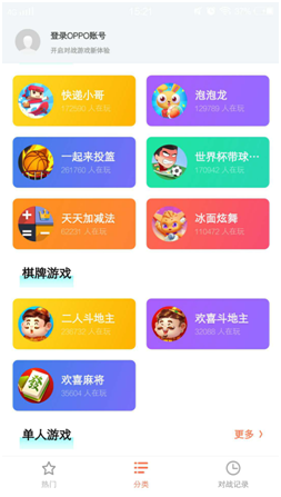 目前,大家玩的(de)小游戏(xì),主(zhǔ)要依托于微信这个平台,是它其(qí)中的版块之一。而OPPO小游戏作为一(yī)个独立(lì)APP的(de)载体(tǐ),拥(yōng)有更多(duō)流量入(rù)口,玩(wán)家可以通(tōng)过OPPO软件商店、OPPO浏览器、OPPO游戏中心、OPPO社区等多个渠道下载体验(yàn)。欧陆娱乐在进行体验时发现,OPPO小游戏(xì)在开(kāi)放之(zhī)初,就已经有三款棋牌(pái)游戏上(shàng)线,分别是《二人斗地主》、《欢喜斗地主》和(hé)《欢喜麻将》,玩家需要登录OPPO账号,才(cái)能参与对局游戏。此外,据(jù)OPPO官方发布的消息,目前其小游戏的(de)用户量(liàng)已经超过(guò)300万。
