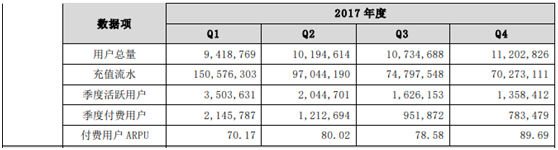 以地方麻将市场龙(lóng)头闲来麻(má)将为例,对(duì)比其2016年第四季度和2017年第四季度的数据(jù)。2016年第四季度充值流(liú)水(shuǐ)高达1.77亿元,而2017年第四季度(dù)的流水则为7027万元,下降60%还多。季度活跃用户也从435万人(rén)下降到135万人(rén),季度付费用户则(zé)从249万人下降到78万人。
