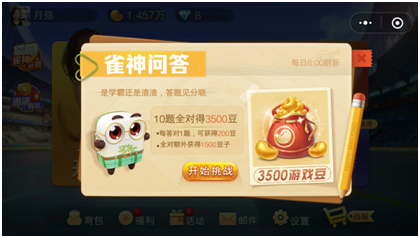 从《腾讯欢乐麻(má)将》的微信小游戏设计(jì)上来看,大厅里增加了一个“雀(què)神(shén)答(dá)题”板块,玩(wán)家(jiā)可以通过参与答题,赢(yíng)得(dé)游戏豆,并在游(yóu)戏对局时进行支付。年(nián)初,直播(bō)答题曾引领过(guò)朋友圈一(yī)股热(rè)潮,此次“雀神答题”只是做(zuò)了一个借鉴,不(bú)仅为玩家获(huò)取游戏豆提(tí)供了(le)一个(gè)新方法,也增加了游戏(xì)的趣味性,更能激励玩家不断参与游戏,有助于用户留存。