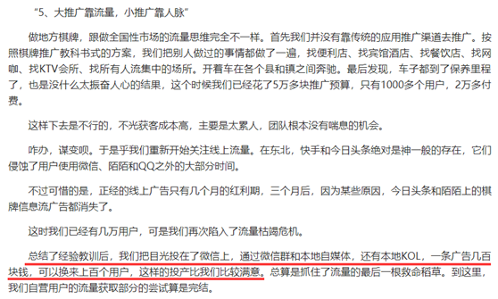 其实在地(dì)方棋(qí)牌兴(xìng)起(qǐ)之(zhī)初,不少平台的推广人员就盯上(shàng)了地方(fāng)微信公(gōng)众号等自媒体,在文(wén)章内容合适的(de)情况(kuàng)下,用户(hù)转化非(fēi)常不错。小编记得,去年年底的时候,一个地方棋牌的(de)创业者写了一篇这样的文(wén)章(zhāng)《本地棋牌游戏运营年终总(zǒng)结:风险与机遇并存(cún)》。在文章中作者提(tí)到过,他们的推广(guǎng)团队(duì)一(yī)开始主打线下(xià),用户增长(zhǎng)和付(fù)费率并不高。后(hòu)来(lái)专攻微信群和本地自媒体,一条广(guǎng)告(gào)几百块(kuài)钱,可以换来上百个用(yòng)户。