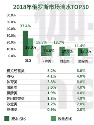 而在俄罗斯,棋牌、博彩类游戏(xì)也占有一定(dìng)的比例(lì)。报告中显示,在2018年俄罗斯市场(chǎng)流(liú)水TOP50中,博彩(cǎi)类和棋牌类游戏(xì)产品(pǐn)的数(shù)量占比相同的情况下,博彩(cǎi)游(yóu)戏的流水更高,为(wéi)3.0%,而棋牌游戏(xì)的占比略低,为1.9%。早前在对博雅前(qián)海外负责人庞磊的采访中他也表示,看好(hǎo)俄罗(luó)斯的德州扑克市场。