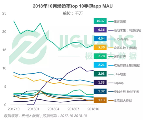 而截至到2018年(nián)10月的最后一周(zhōu),中国的手游市场用户规模达5.27亿,行业的月均DAU为(wéi)1.01亿。那(nà)么,棋(qí)牌游戏(xì)在其中(zhōng)的表现怎么样(yàng)呢?根据极光大(dà)数(shù)据最新(xīn)的统计(jì),10月手游APP渗透率TOP10中,有《欢乐斗地主》、《欢乐麻将全集》和《JJ斗地主》三(sān)款(kuǎn)棋牌游戏(xì)。在休闲游戏类别里,《欢乐斗(dòu)地主》以6.81%的渗透(tòu)率位列第四,仅次于(yú)《开心(xīn)消消乐(lè)》。