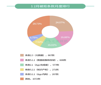 ①如下(xià)图所示,2017年12月(yuè),在统计(jì)的所有样本(běn)数据中,条款2.3(元数据(jù)问题)占据近乎(hū)四分之一的比例;其次是条款5.1.1(主要是用户隐私问(wèn)题(tí)),占比约16.88%;而条款2.1(主要是App完(wán)成度问题,此时被(bèi)拒大礼包还没集中出现)以577例居第三。除此之(zhī)外,Top5中还有5.2.1。