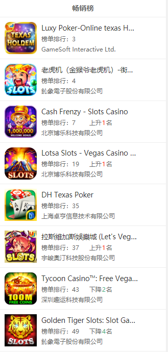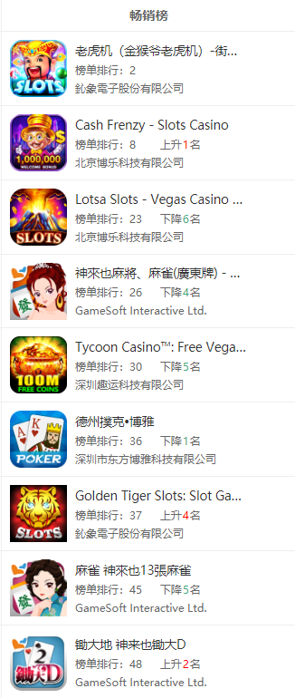 虽然(rán)说国内很多棋牌从(cóng)业者将菲律宾当作其海外(wài)业(yè)务开(kāi)展的首(shǒu)选,但说(shuō)实话国内厂(chǎng)商在菲律宾(bīn)当地的棋牌市(shì)场占比不算高。GooglePlay畅销榜TOP50中,有5款游戏3家公司入榜,其中博乐(lè)科技砍(kǎn)下三席(xí),占据半壁江山(shān)。AppStore畅销榜TOP50中,则(zé)共有4款游戏(xì)2家公司入(rù)榜,博乐科(kē)技再下三席。值得注意的是(shì),拿下菲律宾(bīn)畅(chàng)销榜TOP50的游戏,都是(shì)老虎机游戏。重点关注:北(běi)京博乐(lè)科技有限公司(sī)、鈊象电子股(gǔ)份有限(xiàn)公司(台湾)。