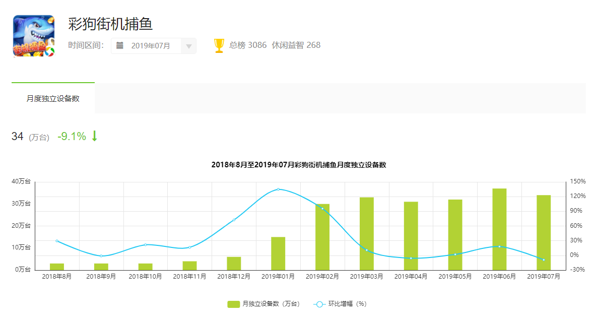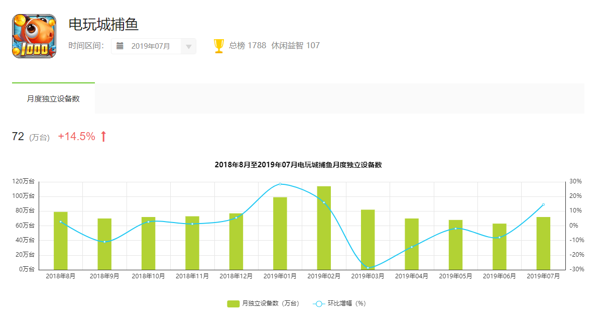 排名第(dì)一位的《电(diàn)玩城(chéng)捕鱼》从今(jīn)年上半年的整体(tǐ)走(zǒu)势来说,一二月的月度独立设备(bèi)数为最高峰期。这也符合棋牌、捕鱼类(lèi)产品的(de)产品周期。春节期(qī)间的用户数(shù)量(liàng)会(huì)迎来一个非常大(dà)的增长(zhǎng)。而第二季度一(yī)般来说(shuō)是棋(qí)牌行业的淡(dàn)季,不过(guò)《电玩城捕鱼》月活控制的还不错,到7月份已(yǐ)经开始(shǐ)开始反弹(dàn)。