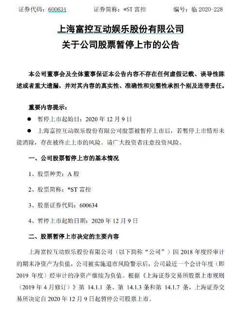 4日晚(wǎn)间,沪市第一低价股*ST富控发(fā)布公(gōng)告,因2018年度经(jīng)审计的期(qī)末净资产为负值,公司(sī)被实施退市风险警(jǐng)示后,公司最近(jìn)一个会计年度(即2019年(nián)度(dù))经审计的净(jìng)资产继续为(wéi)负值。根据《上海证券交易(yì)所股票上市规(guī)则,上海证券交易所决定自2020年12月(yuè)9日起暂停公司股票上市。