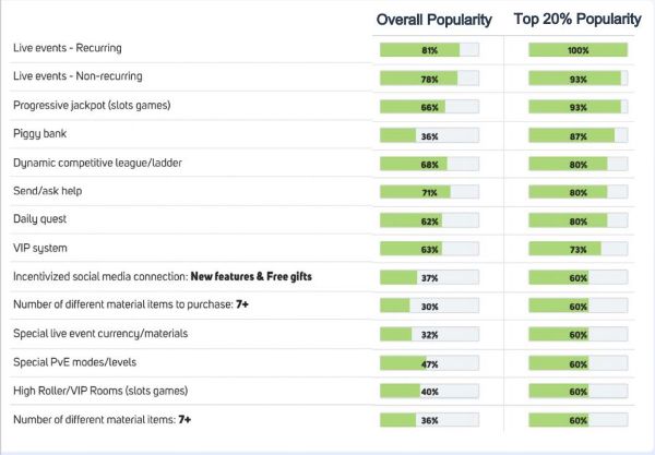 棋牌游戏中(zhōng)的头部产品都有一些关键性特征,比如每日任务、线(xiàn)上排(pái)名、收藏系统等等,下(xià)面一张图也显(xiǎn)示(shì)了棋牌(pái)游戏的(de)不同功能(néng)的(de)使用情况。我们可以看到在线(xiàn)活动、进度是所有棋牌(pái)游(yóu)戏使用率较高的功能(néng),而头部20%的(de)棋牌(pái)游戏所使(shǐ)用的“关(guān)键功能”远高于其他棋牌游戏,换句话说,这些关键(jiàn)功能(néng)也许是它们与(yǔ)众不同的原因。