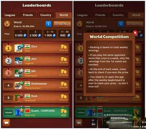 印(yìn)度软件(jiàn)应用畅(chàng)销榜单中,社交(jiāo)类APP占据了大半,所以具有社交属性的棋牌(pái)游戏同样受欢(huān)迎。目前各厂商在印度推出的棋牌游戏(xì)中(zhōng),不仅(jǐn)可以(yǐ)通过(guò)分享链(liàn)接(jiē)邀请朋友一起玩,还加入了各种(zhǒng)排行(háng)榜,包括赛季排行(háng)榜、好(hǎo)友排行(háng)榜(bǎng)、国(guó)家排行榜、世(shì)界排行榜(bǎng),排(pái)名靠前(qián)还能够(gòu)获得(dé)金币奖励。