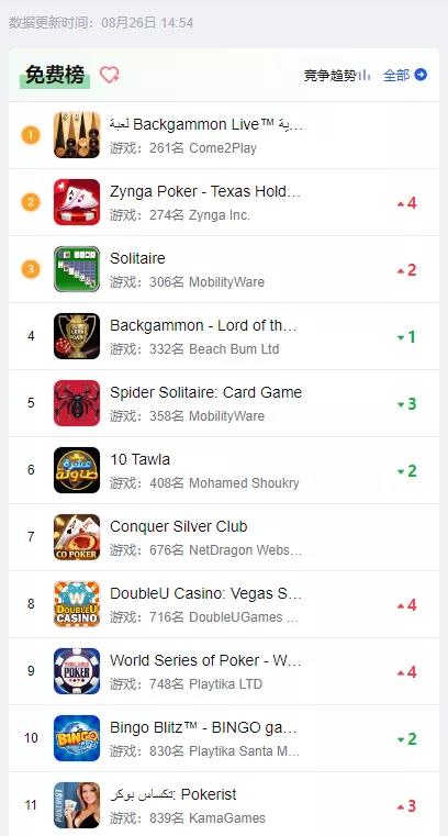 从这份榜单中可以看出,除去为数(shù)不多(duō)的(de)宾果游戏。埃及的娱乐游戏已(yǐ)经逐渐(jiàn)被棋牌类(lèi)游戏所占据。虽(suī)然与印度这种娱乐游戏榜单基(jī)本上都是棋牌游戏(xì)相比还有(yǒu)一定差距(jù),但还是可以看出(chū),埃及棋牌游戏的增长势头强劲。