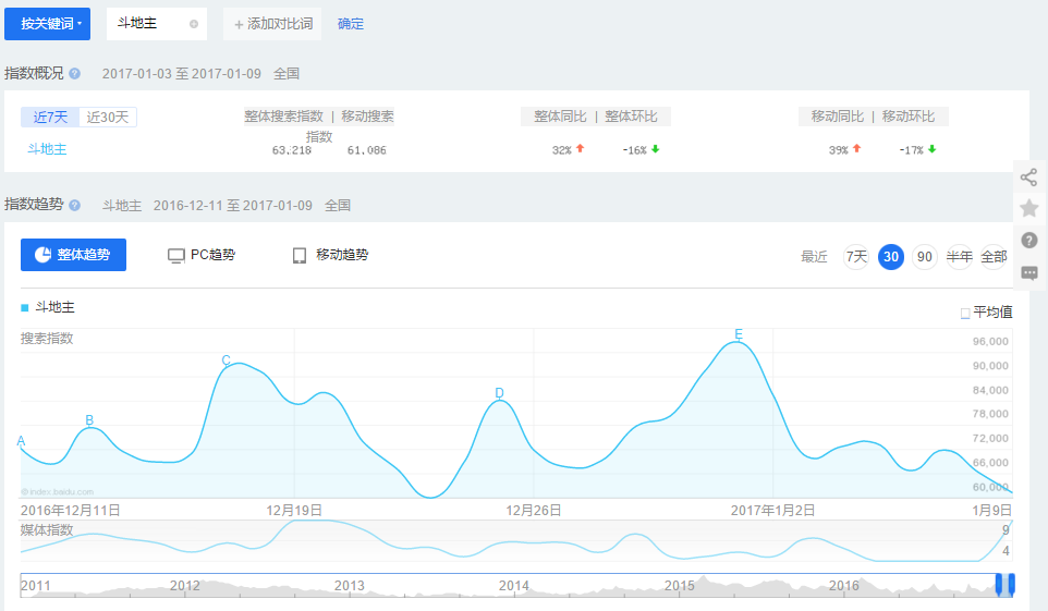 60000+的(de)百度指数(shù)数据,足以说明这款作品时至今(jīn)日,仍(réng)然是最火爆的棋(qí)牌游戏之(zhī)一。曾(céng)听一位(wèi)业(yè)界前辈说:“棋牌游(yóu)戏行业(yè)想(xiǎng)要做大,必须(xū)将(jiāng)公共棋牌的市场拿(ná)下。而拿下斗地主(zhǔ),也就拿(ná)下了公共棋牌市场的(de)一(yī)半。”
