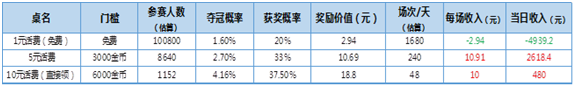 从(cóng)充值上看,1元≈5000金币;从兑换(huàn)上看,1元(yuán)=4元(yuán)宝=40话(huà)费券。但是(shì)博雅(yǎ)斗地主(zhǔ)采(cǎi)用(yòng)的是宽松的经济体系,会通过破产保护、签到、活动等(děng)方式大(dà)量发送金币,所以该表(biǎo)格仅能反映趋势(shì)。但已能发现,在实物比赛(sài)场中,博雅斗地主(zhǔ)完(wán)全依靠自己采购话费、流量来做留存,成本由(yóu)自己承担。只要获(huò)得一定实物,用(yòng)户对产品(pǐn)体验的容忍度很高。