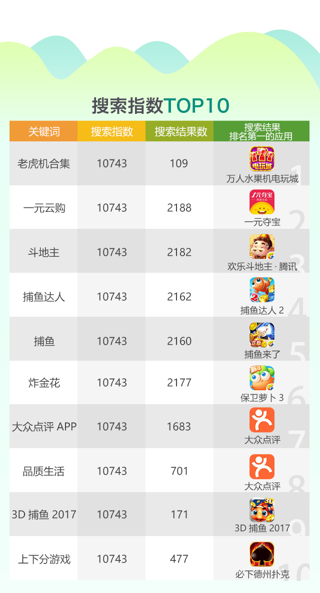 从上述榜单可(kě)以看出(chū),棋(qí)牌、捕鱼(yú)、街(jiē)机类的关键词(cí),占据了搜索指数TOP10中的(de)6席,而所谓的一元夺宝,也或(huò)多或(huò)少带有一些**性(xìng)质。
